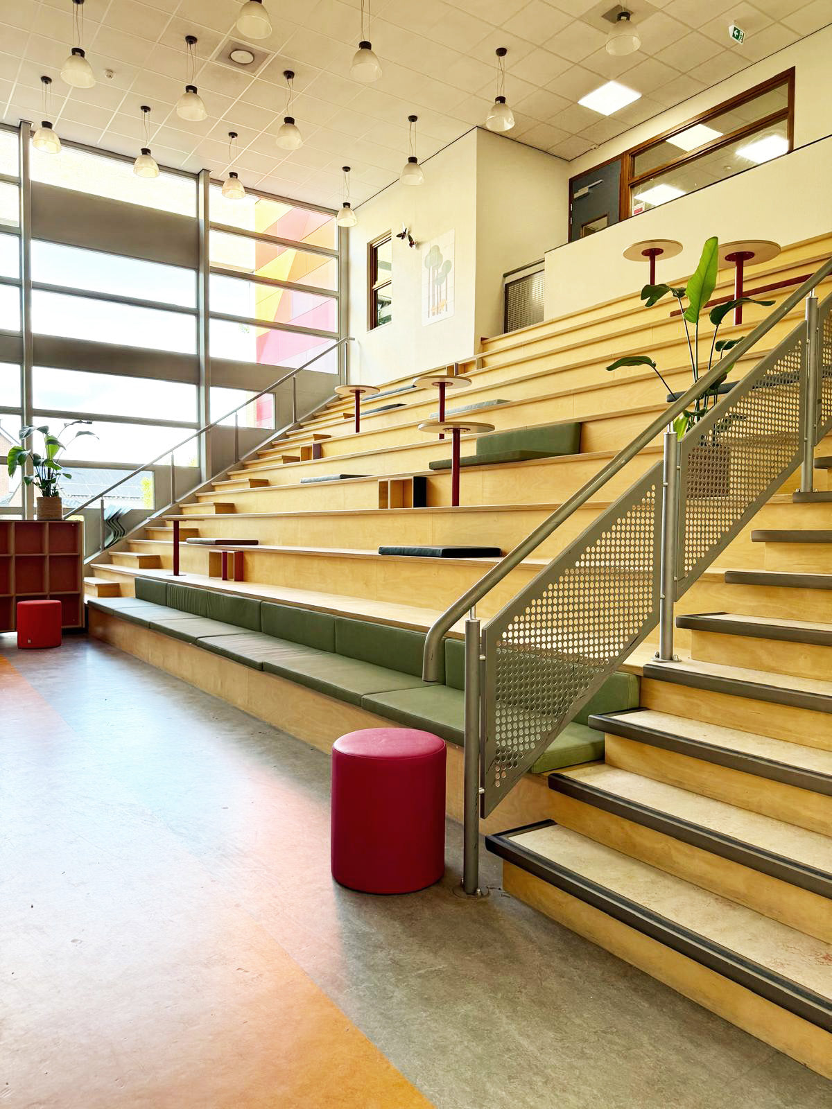 De tribune wordt gebruikt voor vieringen, BSO, peuterspeelzaal én de bibliotheek. Er kwamen zitkussens op de treden en vaste tafeltjes. “Het werd een multifunctioneel middelpunt van het gebouw.”