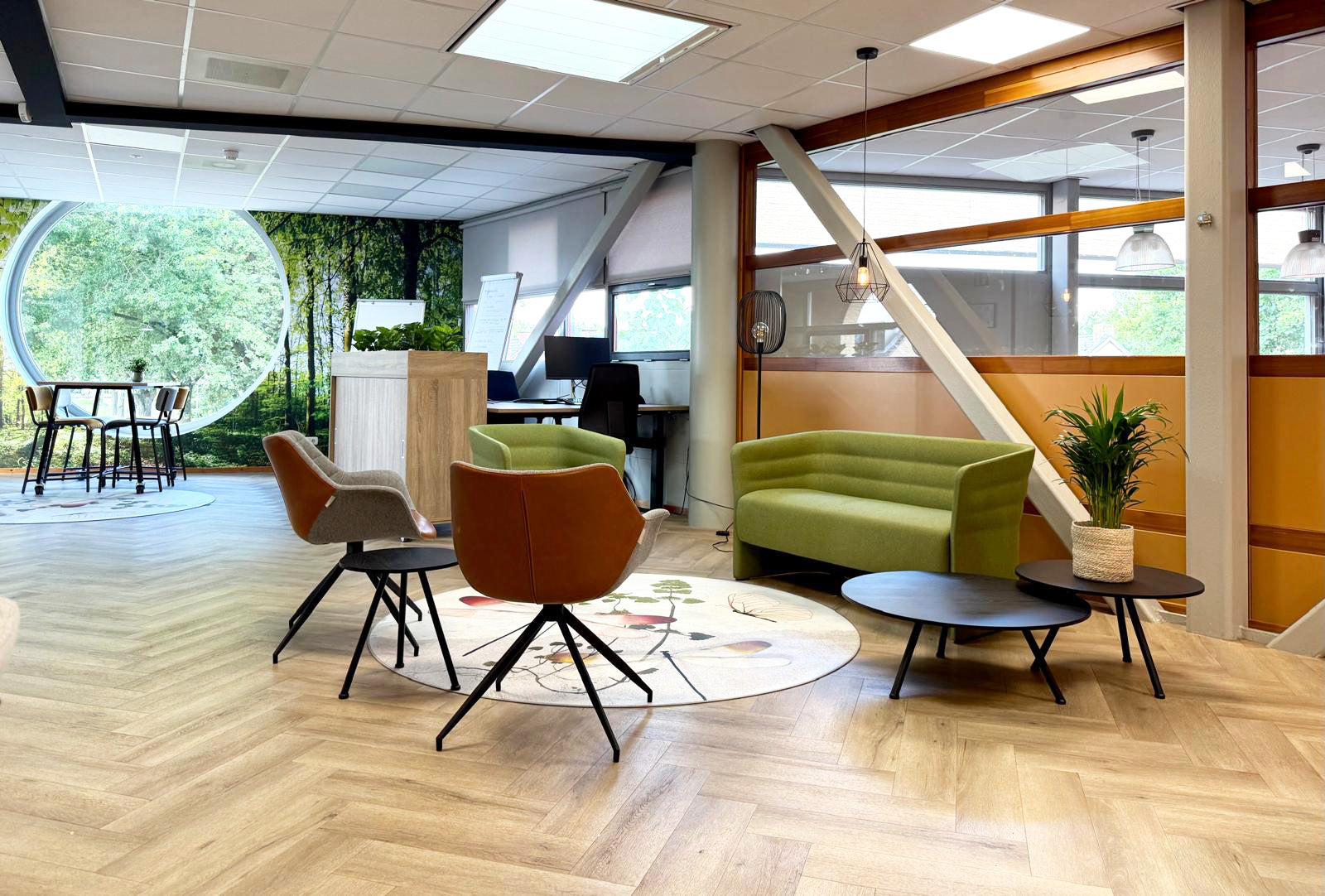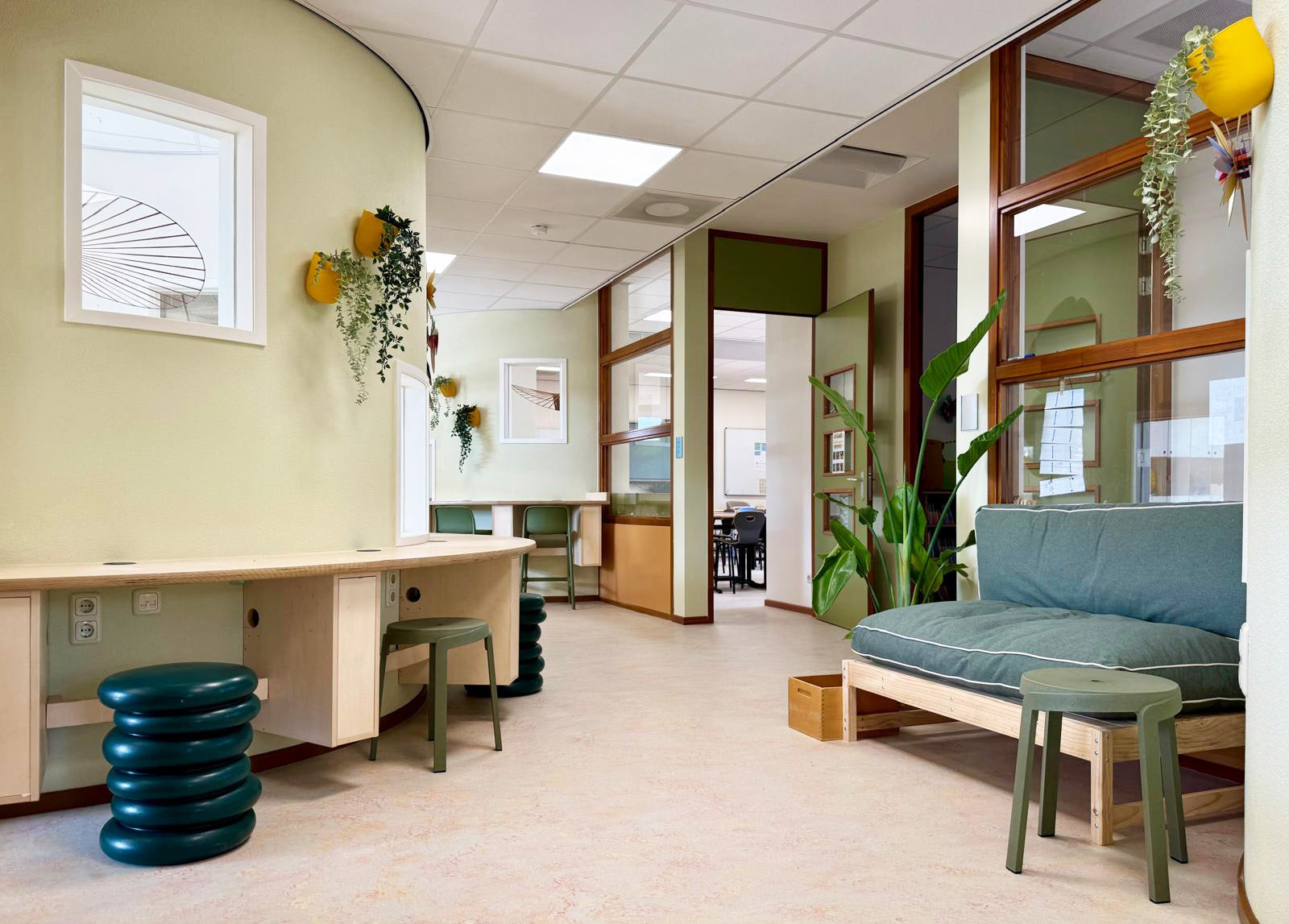 Styling bracht alles samen. Zo brachten we bewust de rondingen van het gebouw terug in bijvoorbeeld kleden, tafels en poefjes. Zelfs de teamkamer werd op het laatste moment hierin meegenomen. Elke vleugel kreeg een eigen kleur. “Wat eerst rommelig en onrustig voelde, is nu één geheel. Het voelt ruim en uitnodigend, bijna als een huiskamer.”