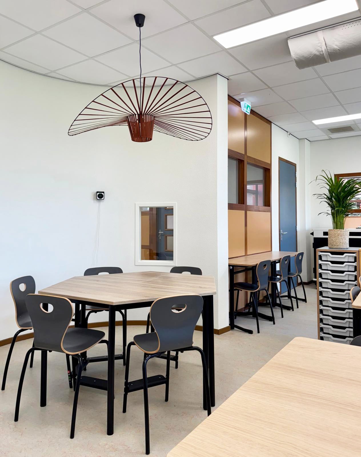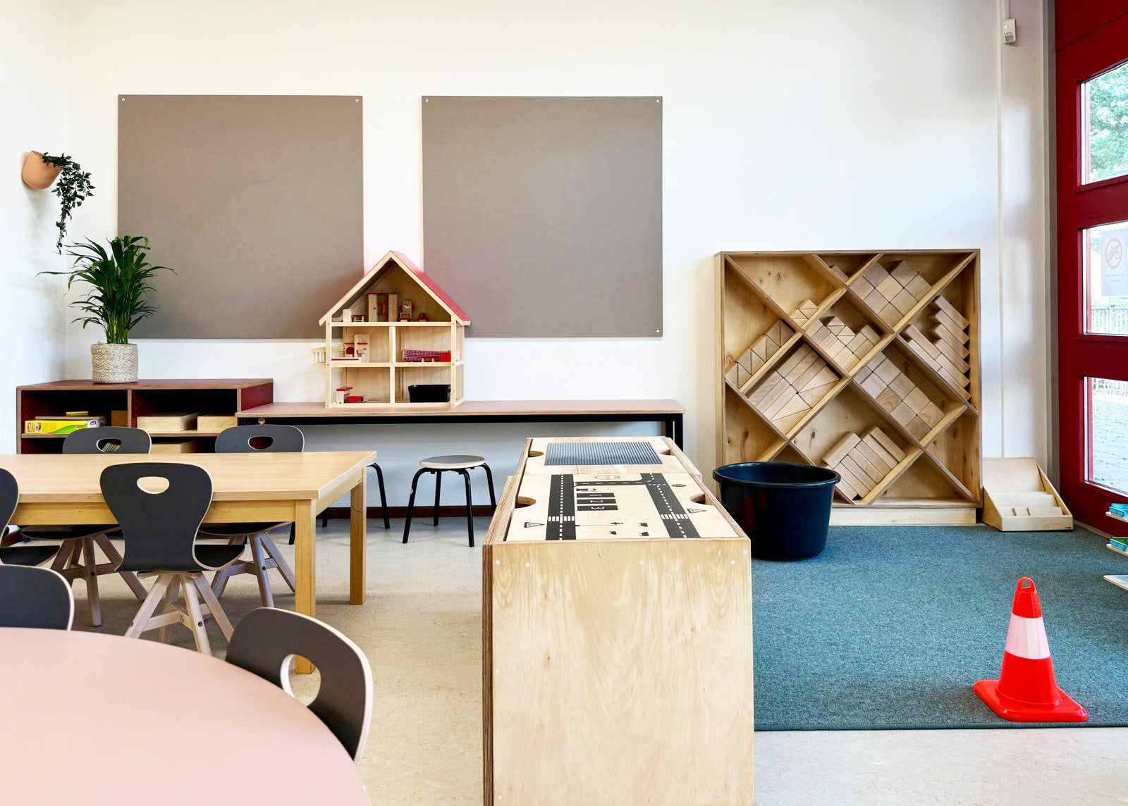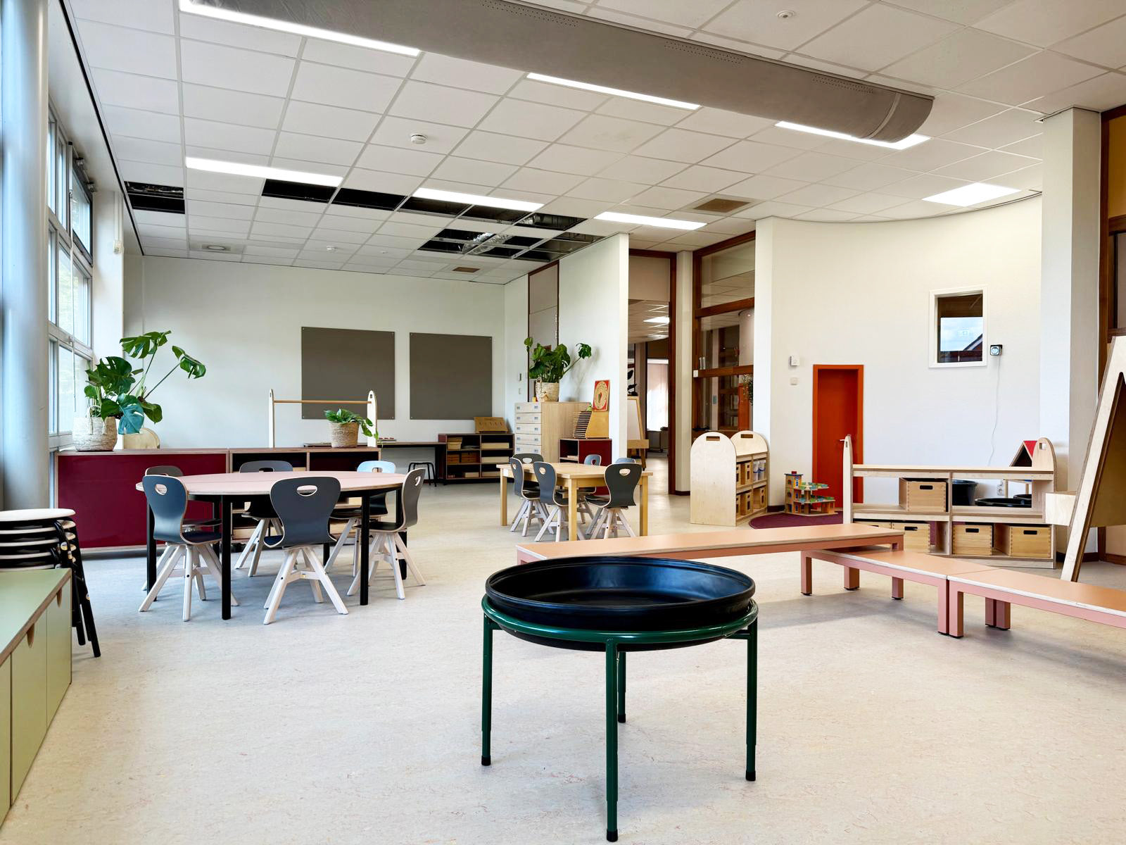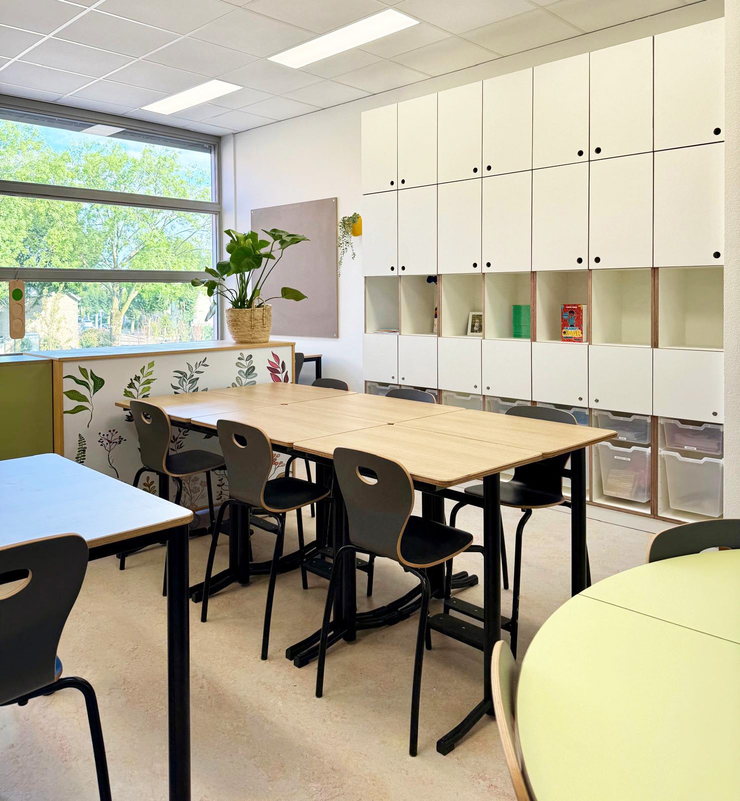 Annemarie vroeg onderwijsvormgever Ellen Kuster mee te denk over het vertalen van de werkwijze naar interieur. Annemarie: “Ik vond het lastig om los te laten, maar Ellen pakte de regie op een manier die vertrouwen geeft. Ze observeerde, verdiepte zich in onze manier van werken, liep rondes door de school, inspireerde en nam het team mee. Het voelde alsof ze onderdeel van ons team was.”