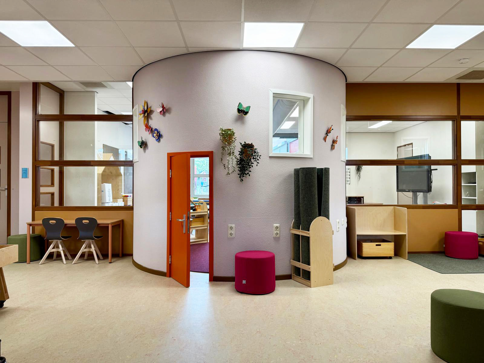 Bij de kleuters werden er kleuterdeurtjes geplaatst in de ronde wanden. Hierdoor stappen ze direct het lokaal binnen. De lokalen en gangen in de onderbouw vormen samen één grote leerplek. Elk lokaal heeft een eigen speelhoek: een huishoek, bouwhoek, themahoek en atelier. “Zo heeft elke hoek veel ruimte en kunnen de kleuters bij elkaar spelen, of ‘scharrelen’, zoals Ellen zou zeggen. Door de glaswanden hebben leerkrachten zicht op de kinderen, ook in de verbindingslokalen waar bewust geen deuren meer in zitten. Zo kwam er rust, overzicht en verbinding. Traditioneel onderwijs in een nieuw jasje!