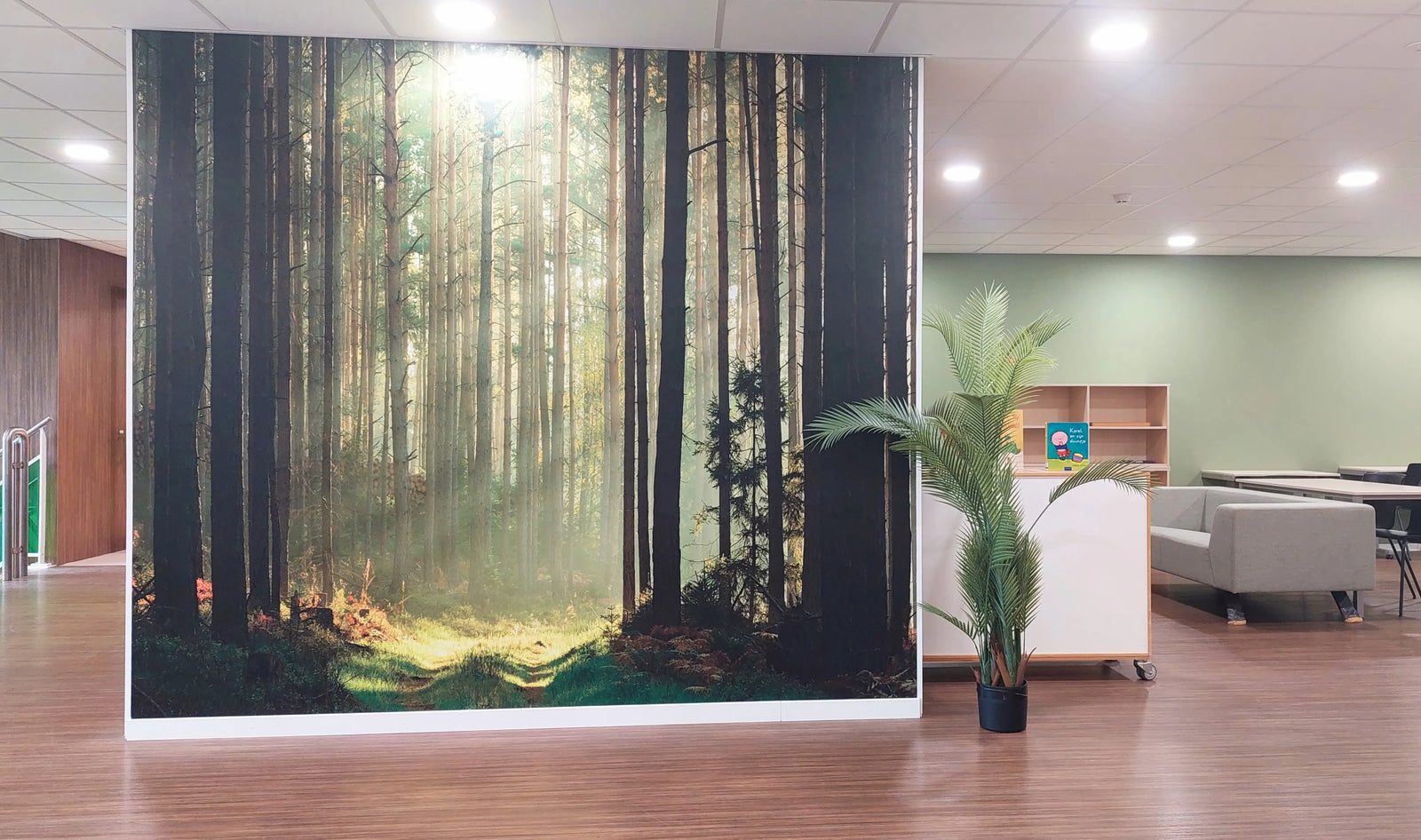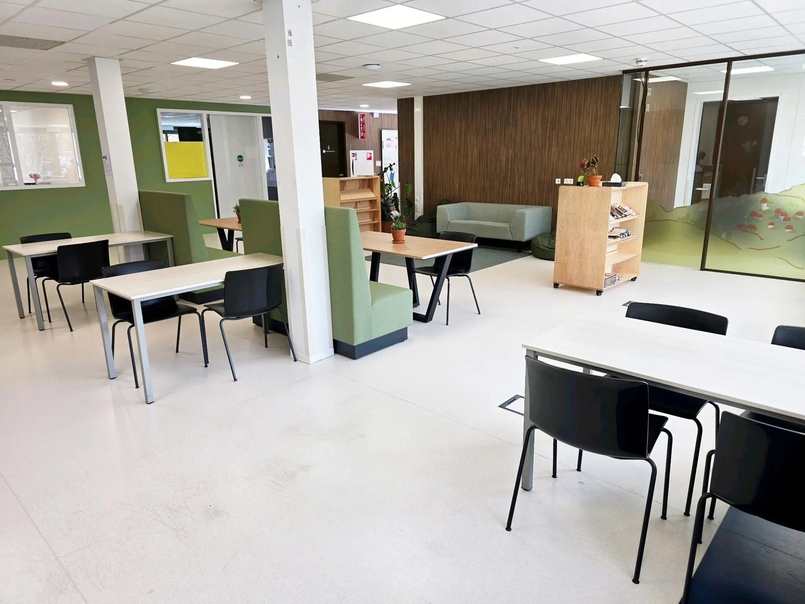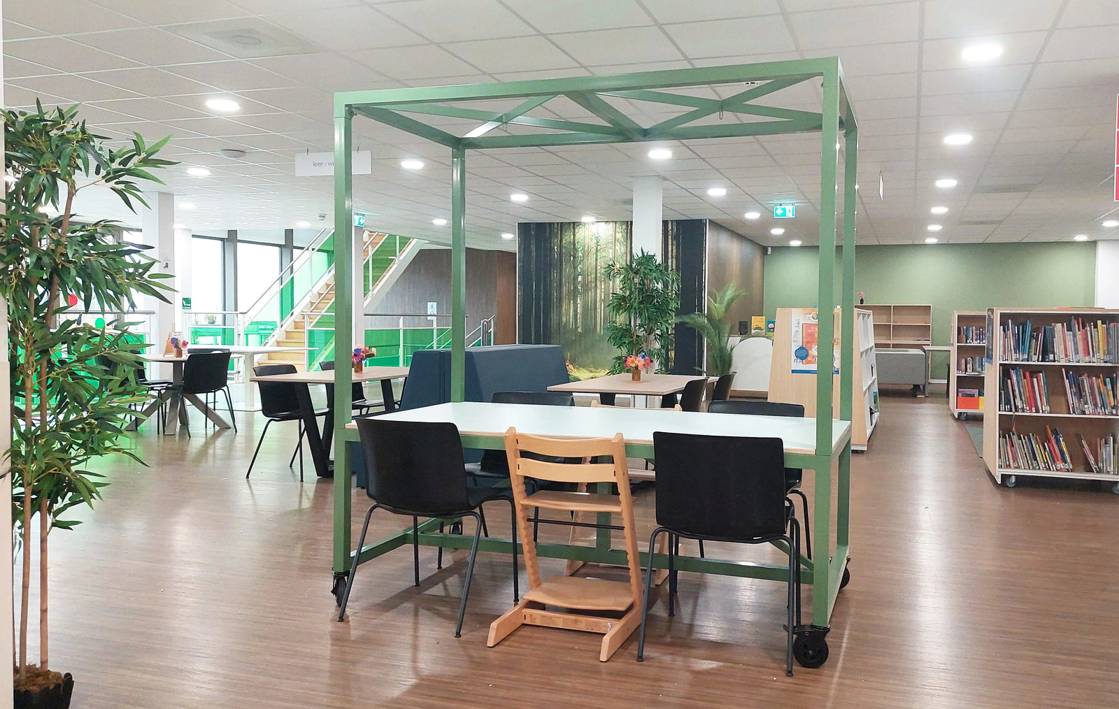 We werden gevraagd voor meubels op de twee leerpleinen, maar Monica miste warmte en adviseerde om te beginnen met kleur. Zij greep de groene glazen balustrade aan om buiten naar binnen te halen. Dat past hier goed; College De Trappenberg heeft een plek midden in het bos. Er kwam een groene muur en een XXL bosprint, waarmee de sfeer compleet veranderde.
