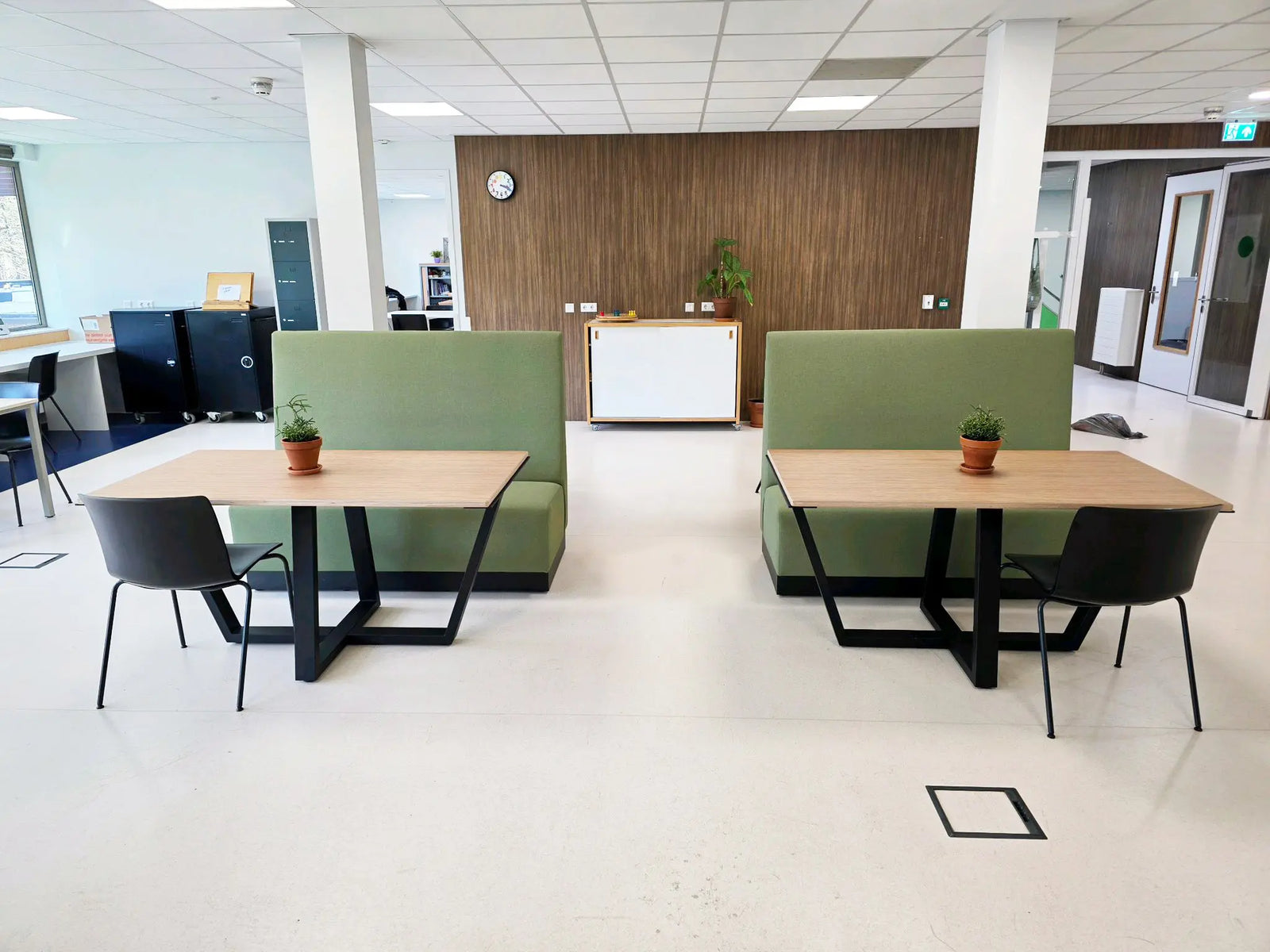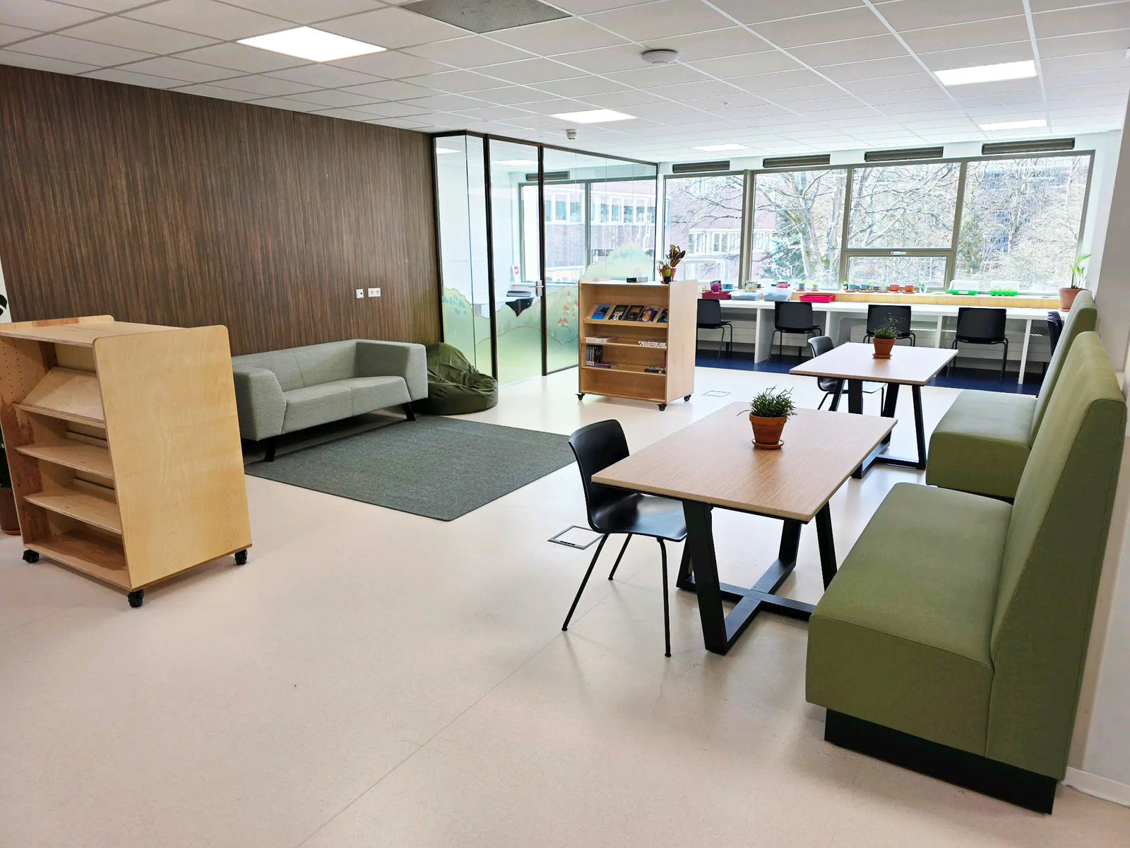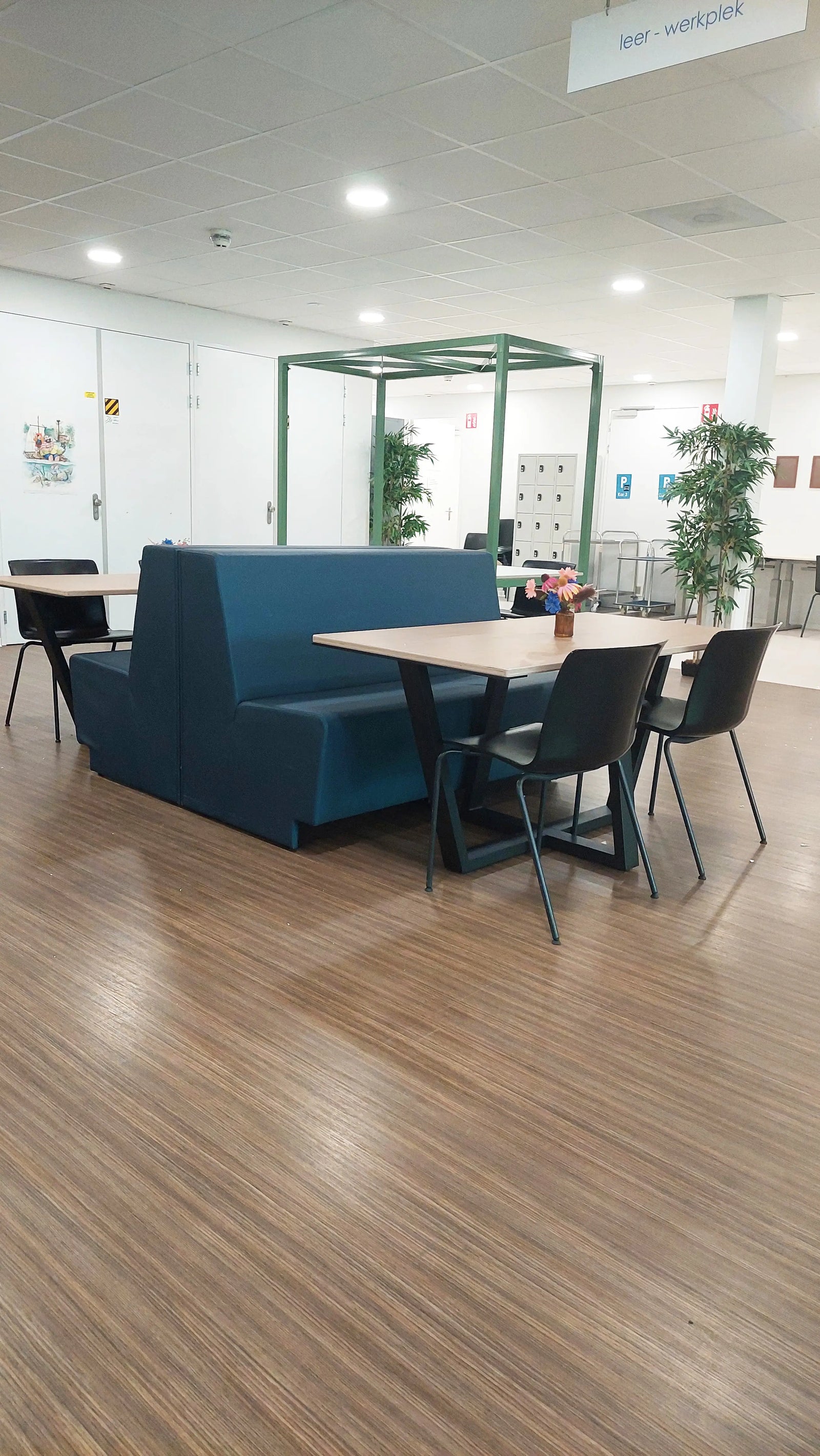 We werden gevraagd voor meubels op de twee leerpleinen, maar Monica miste warmte en adviseerde om te beginnen met kleur. Zij greep de groene glazen balustrade aan om buiten naar binnen te halen. Dat past hier goed; College De Trappenberg heeft een plek midden in het bos. Er kwam een groene muur en een XXL bosprint, waarmee de sfeer compleet veranderde.