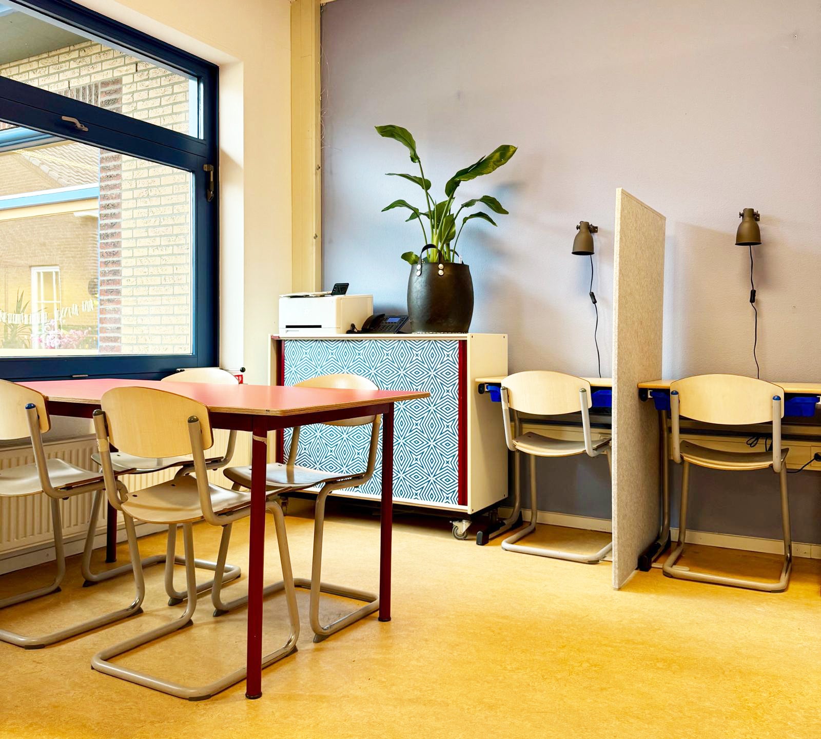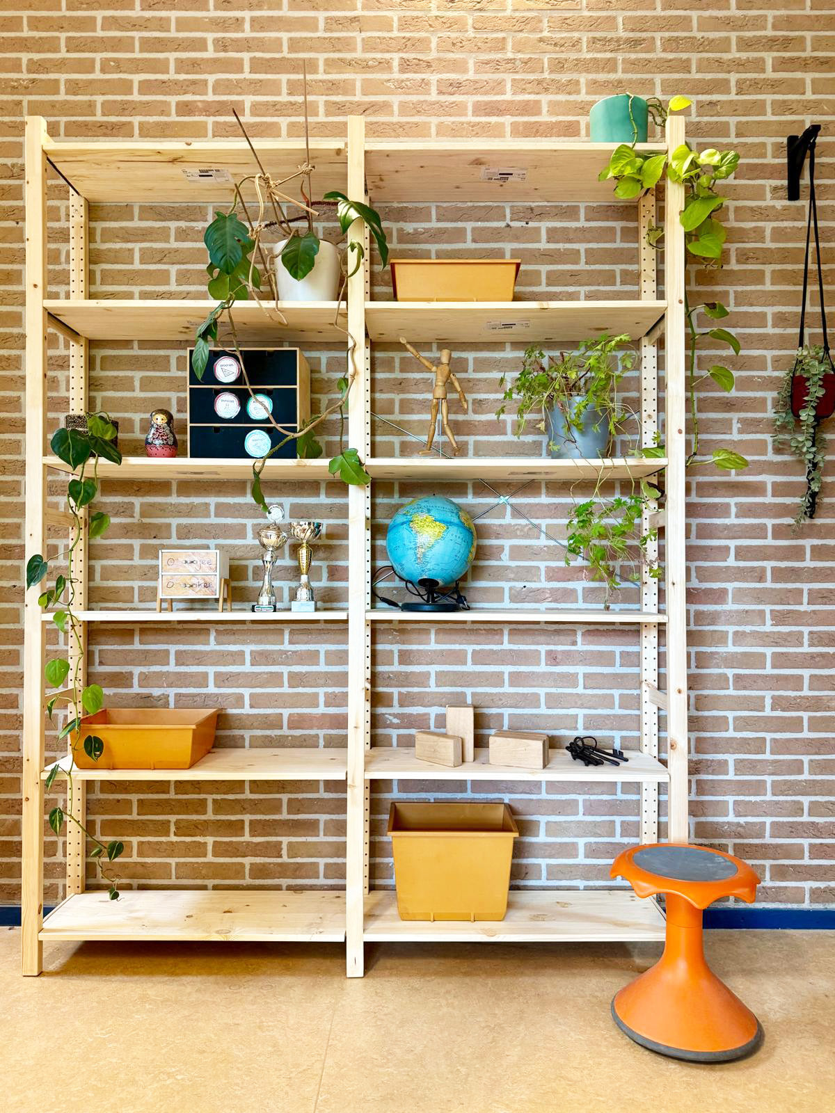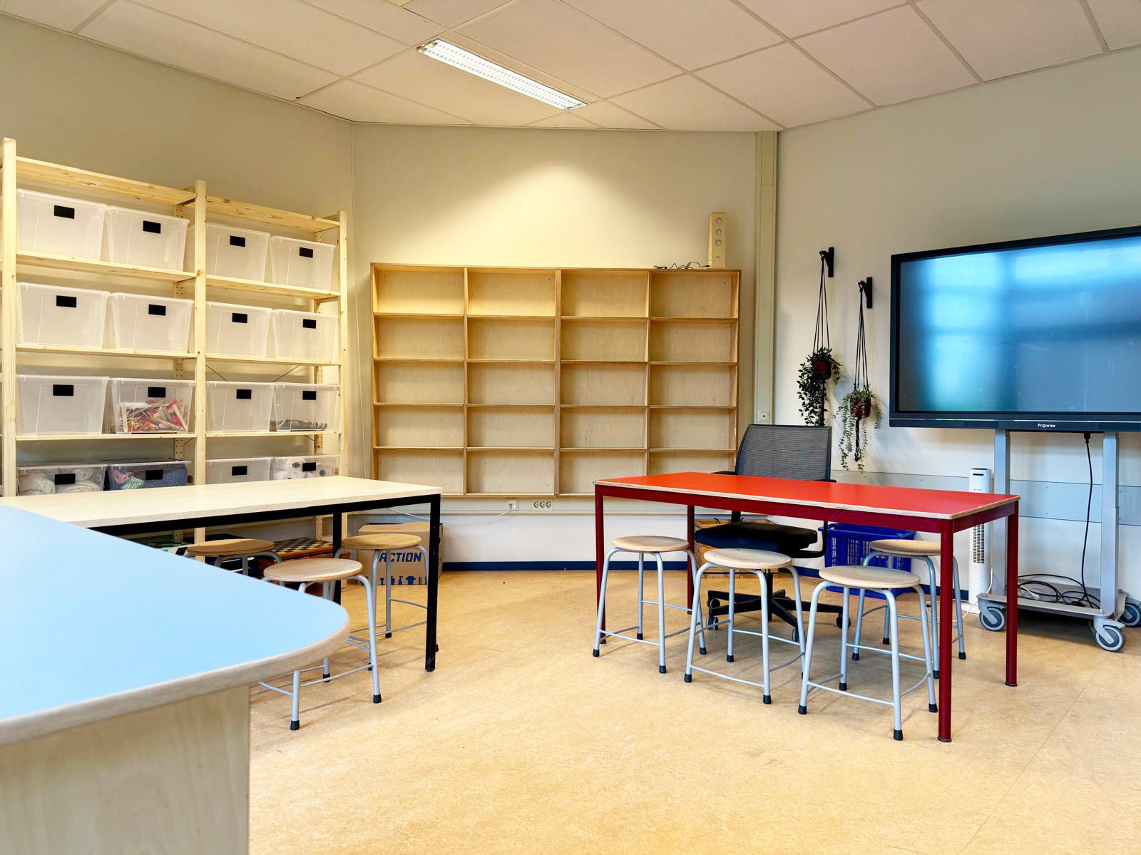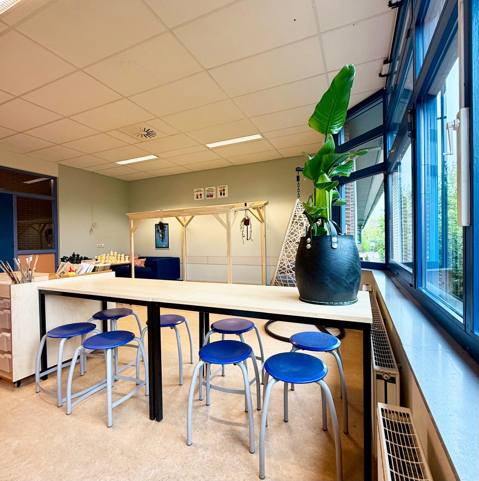 Er kwam een studieruimte met verschillende werkplekken, zoals een frametafel, treinzitjes en stiltewerkplekken. Ook kwam er een speelruimte met theaterhoek, atelier en chillplekken, zoals een fijne hangstoel. Veel meubilair was er al. De wiebelkrukken werden via Marktplaats op de kop getikt. Duurzaam en betaalbaar! Het interieur werd afgemaakt met planten, prikborden en een paar gezellige lampen.