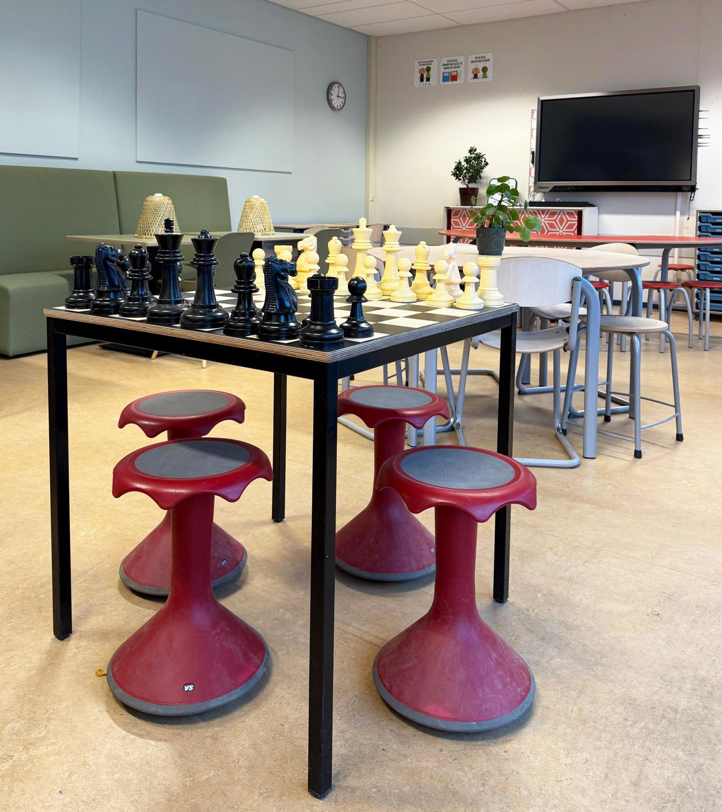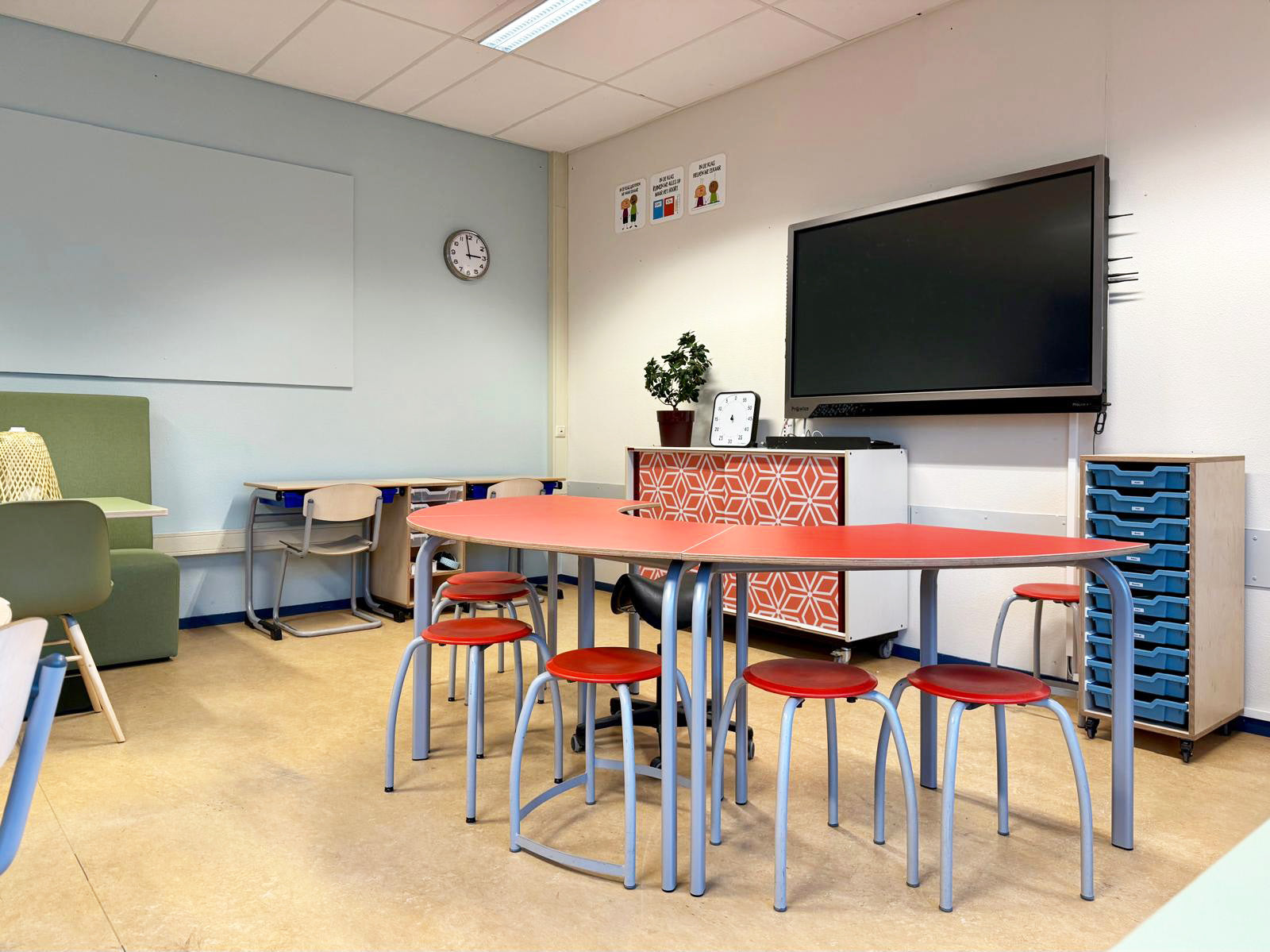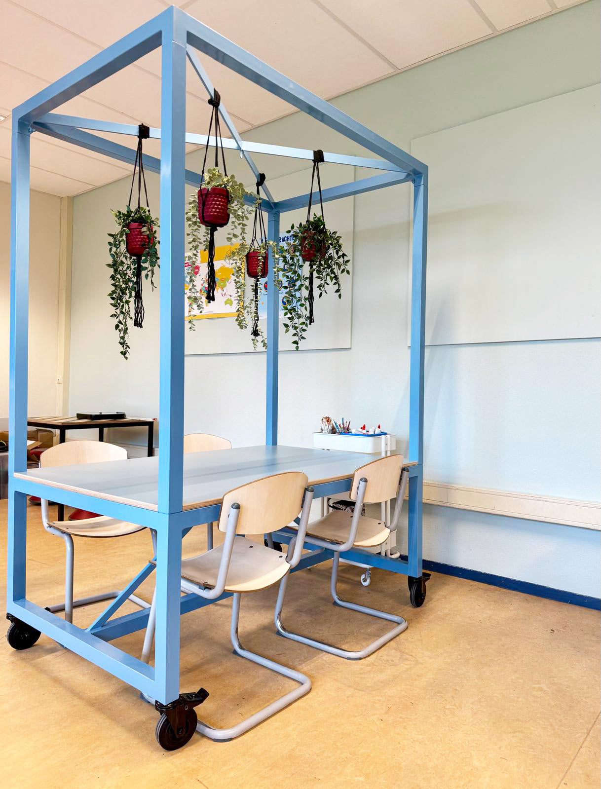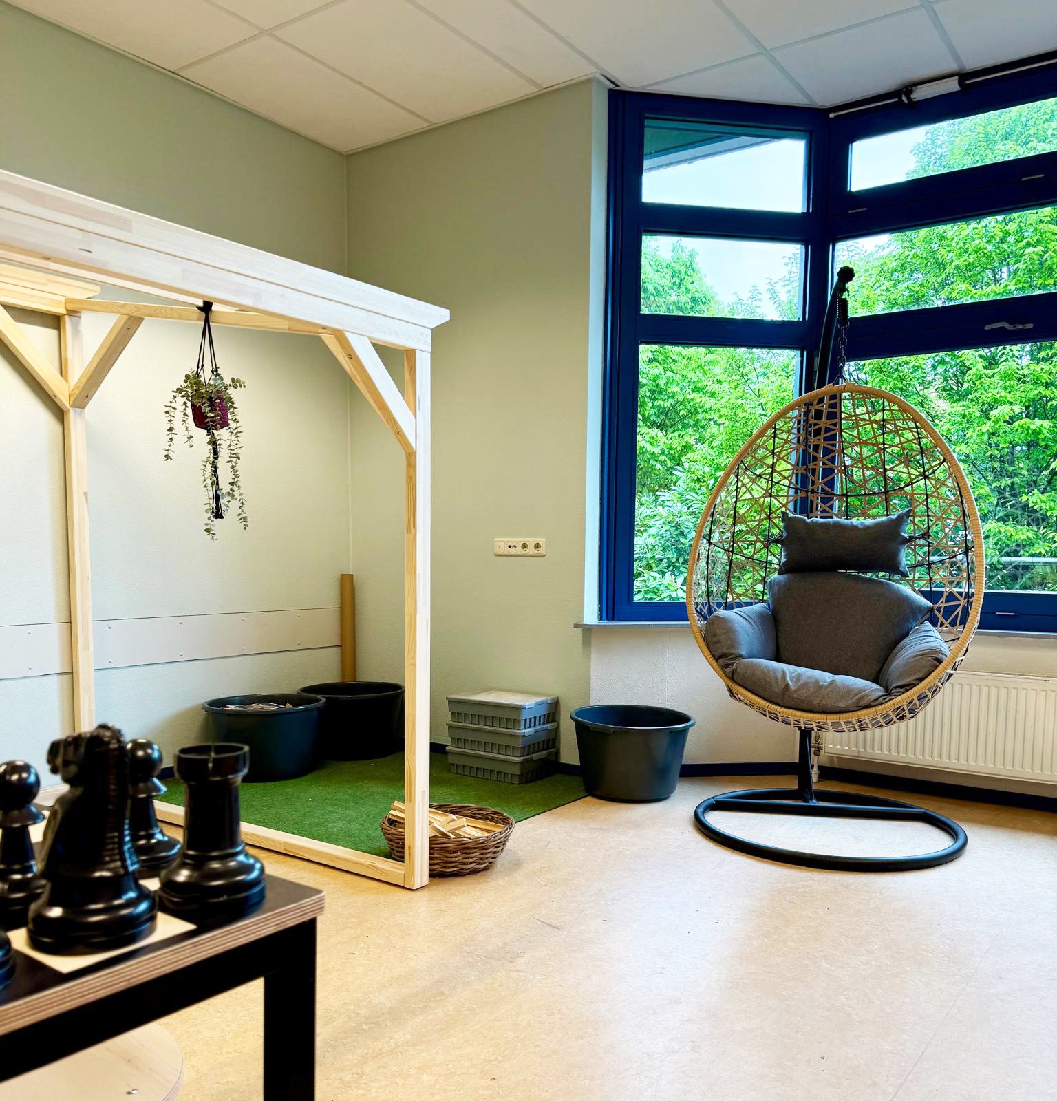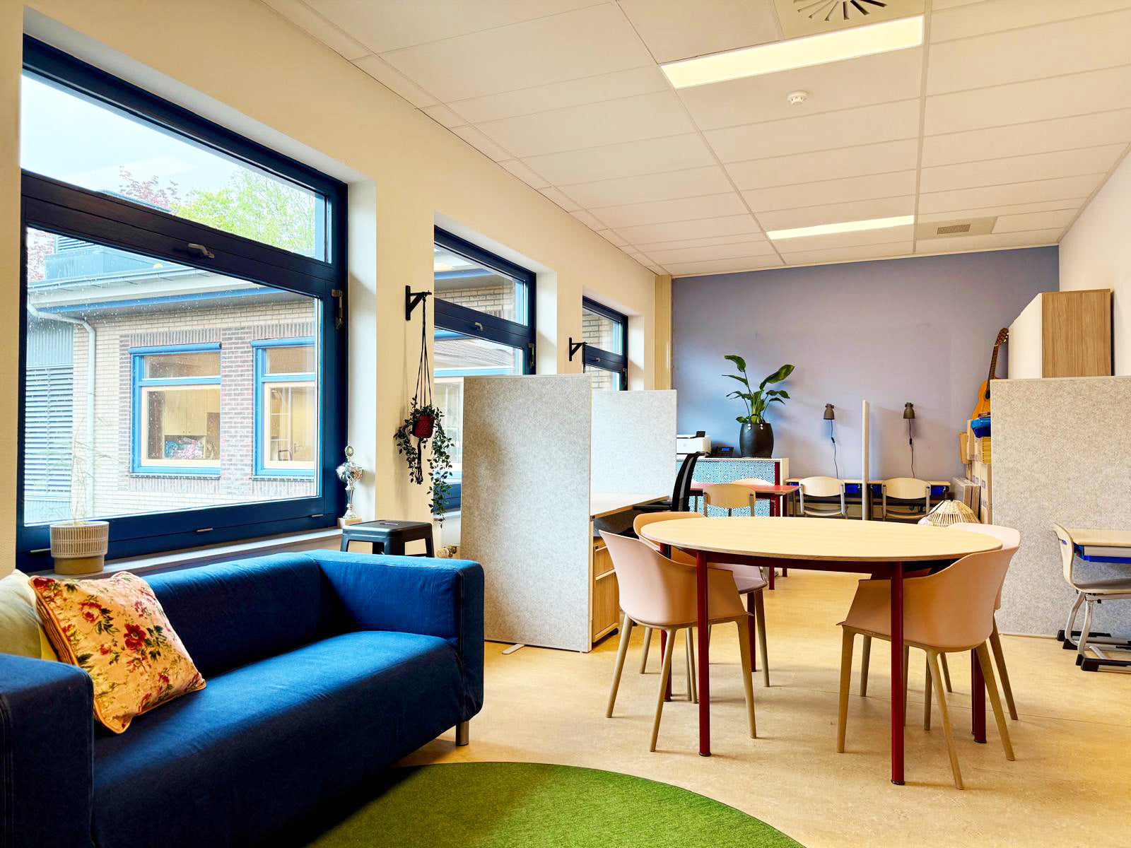 Er kwam een studieruimte met verschillende werkplekken, zoals een frametafel, treinzitjes en stiltewerkplekken. Ook kwam er een speelruimte met theaterhoek, atelier en chillplekken, zoals een fijne hangstoel. Veel meubilair was er al. De wiebelkrukken werden via Marktplaats op de kop getikt. Duurzaam en betaalbaar! Het interieur werd afgemaakt met planten, prikborden en een paar gezellige lampen.