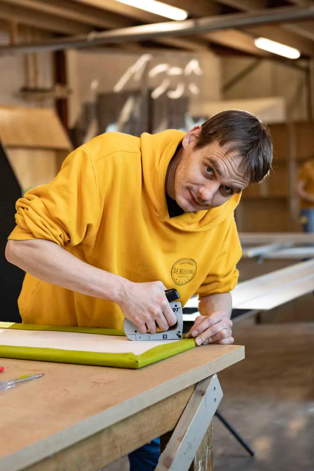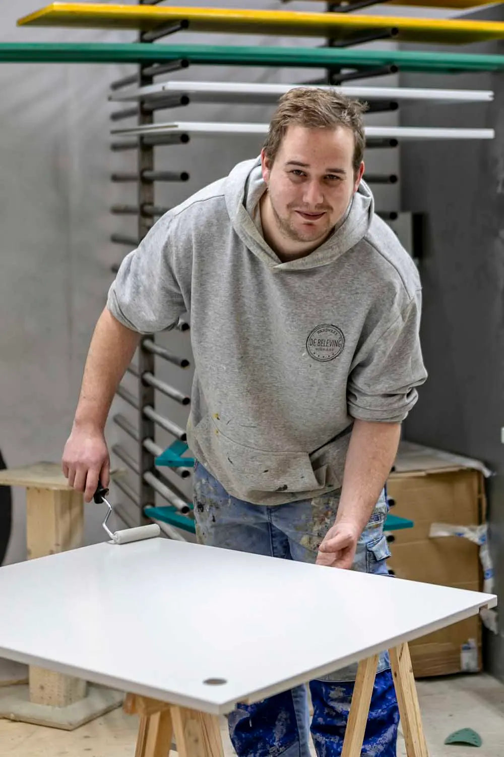 Remon is de lakker.Hij zorgt dat onze meubels netjes afgewerkt zijn. Want ruwe randen en kinderhandjes gaan niet goed samen. Remon is blij dat hij werkt. Hij houdt van bezig zijn, met fijne collega’s die het recht zijn gezicht zeggen als iets beter kan. Want zo zijn we dan ook wel weer.