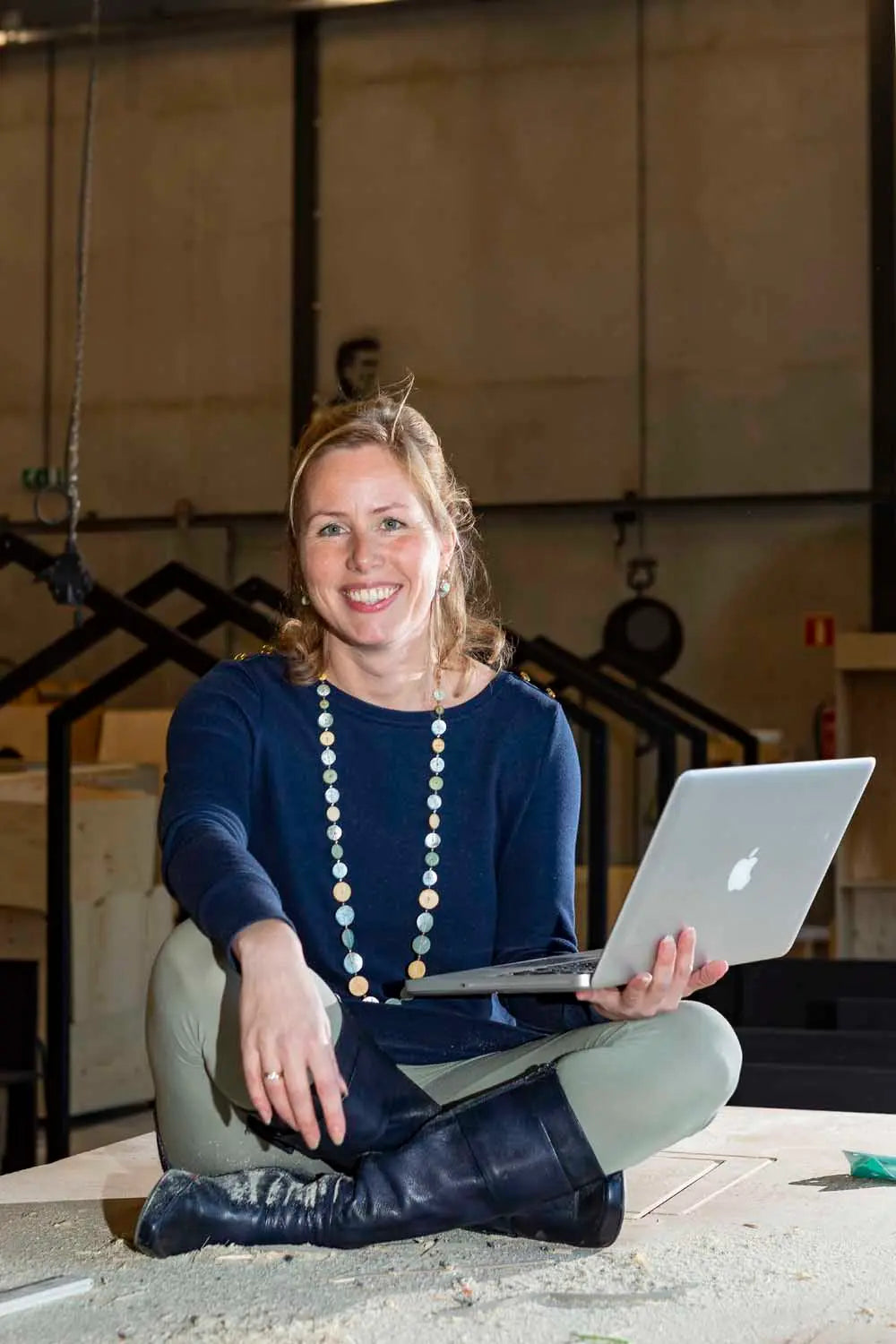 Joan is betrokken op alle niveaus. Ze bedenkt en beschrijft, van strategie tot operatie. Ze houdt ervan met haar laarzen in de modder te staan, vrij vertaald: op de plek waar het gebeurt. Wij hebben geen modder, maar wel zaagsel. Dus kreeg ze een volle lading toen ze op de foto ging. Was ze blij mee natuurlijk.