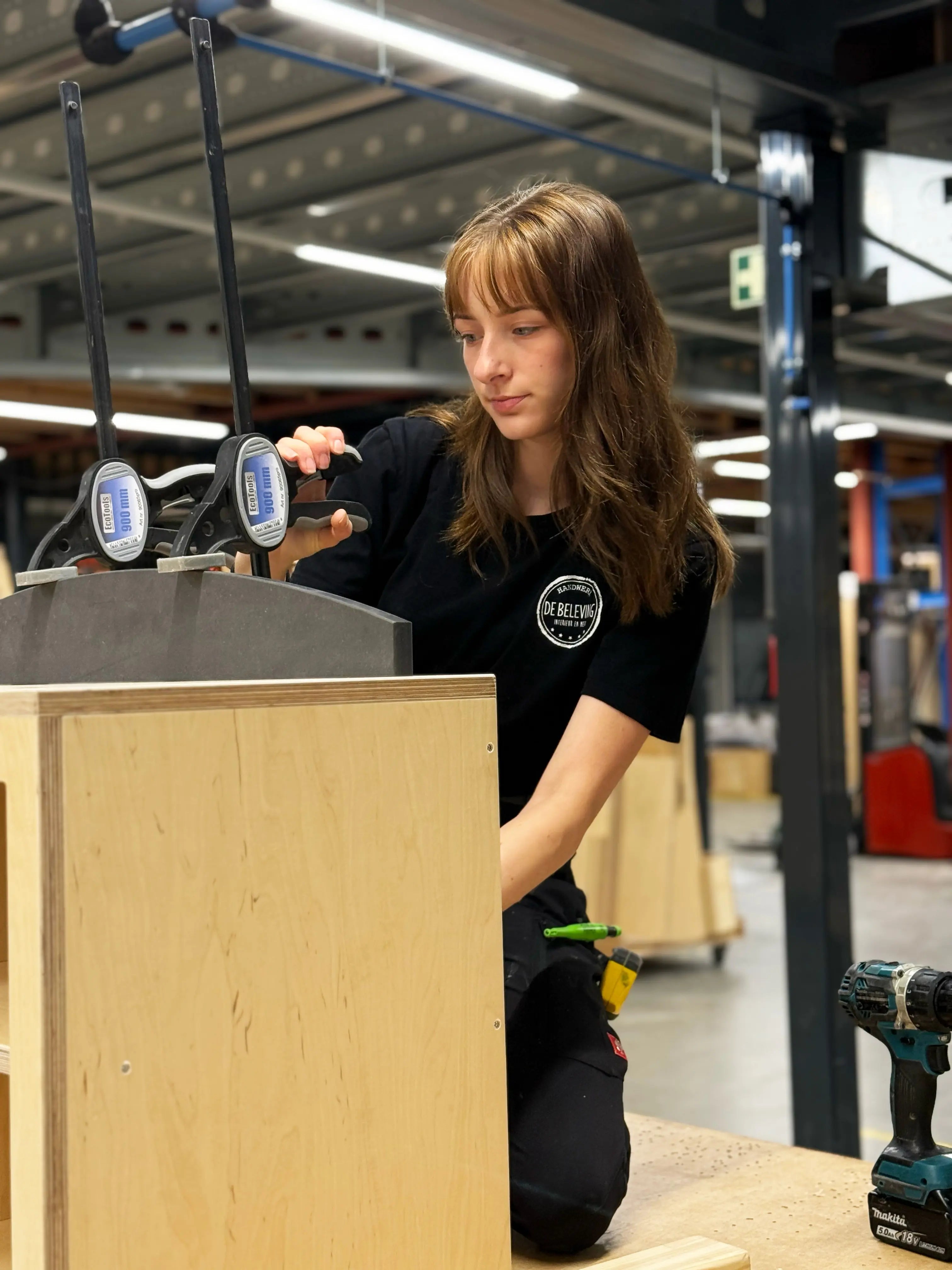 Saffiera is meubelmaker in opleiding en werkt zich in rap tempo door de opdrachten heen. Dan kan ze daarna lekker bij ons aan de slag. Saffiera is van het ‘meters maken’ en houdt ervan als dingen zich herhalen. Lekker ritme én een goede sfeer: zij is voorlopig in onze werkplaats te vinden.